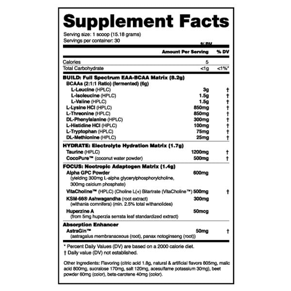Alpha EAA is an efficaciously dosed essential amino acid formula that is unlike any other amino acid product out on the market today. Not only does Alpha EAA include a full-spectrum EAA matrix featuring 8.2 g of EAA’s and 6 g of fermented BCAA’s but we added a focus and hydration complex as well. It’s this focus matrix that really puts this product over the top and differentiates it from any amino based supplement available. Our focus matrix is comprised of a combination of the world’s most popular adaptogen, Ashwagandha KSM-66 and three of the most effective nootropics around, Alpha-GPC, VitaCholine and Huperzine A. To round out this novel formula and enhance it even more, we included taurine and CocoPure to support hydration and AstraGin to increase amino uptake and absorption.